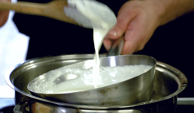 Fonduta sósan var nógu einföld. Mjólkin var hituđ upp varlega í vatnsbađi.