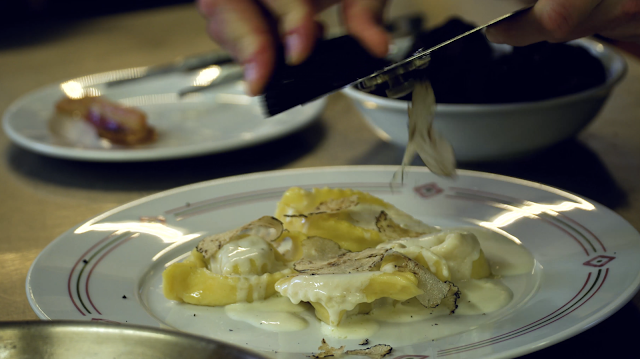 Pastađ var svo lagt á disk, fonduta sósunni sáldrađ yfir, fullt af ferkum trufflum raspađ yfir.
