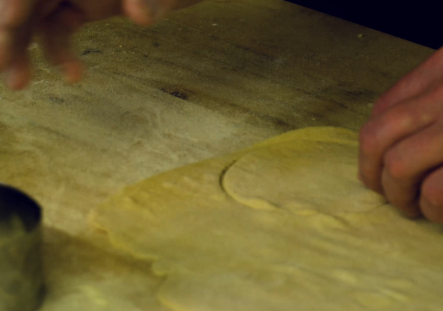 Pastađ fékk ađ hvíla í 30 mínútur í kćli. Svo flatt úr vandlega.